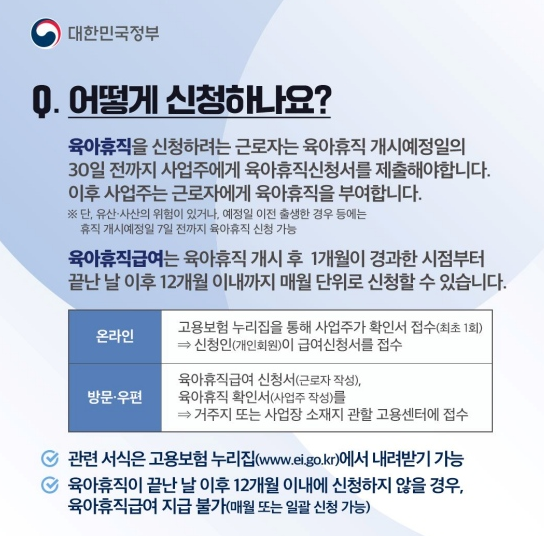 - 육아휴직 기간: 사업주로부터 30일 이상 육아휴직을 부여받아야 해요. (출산전후휴가와 겹치는 기간은 제외)