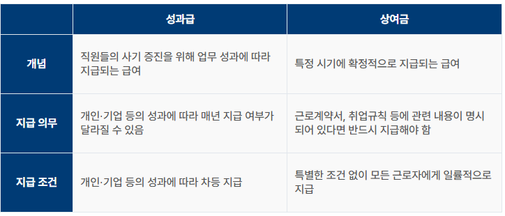 | 포함되지 않는 상여금 | 일회성 또는 비정기적 지급: 특별 상여금이나 회사의 경영 성과에 따라 지급 여부가 불확실하고, 개인의 노무 제공과 무관하게 지급되는 경우. 지급 불확실성: 회사의 경영 성과에 따라 지급 여부나 금액이 변동되는 등 지급 자체가 불확실한 경우. |