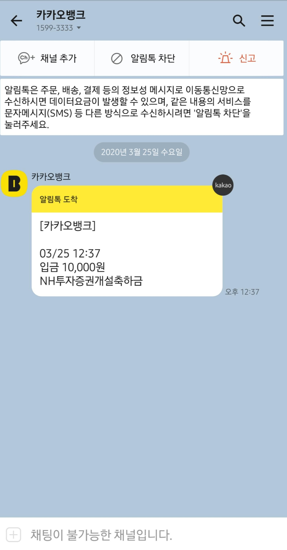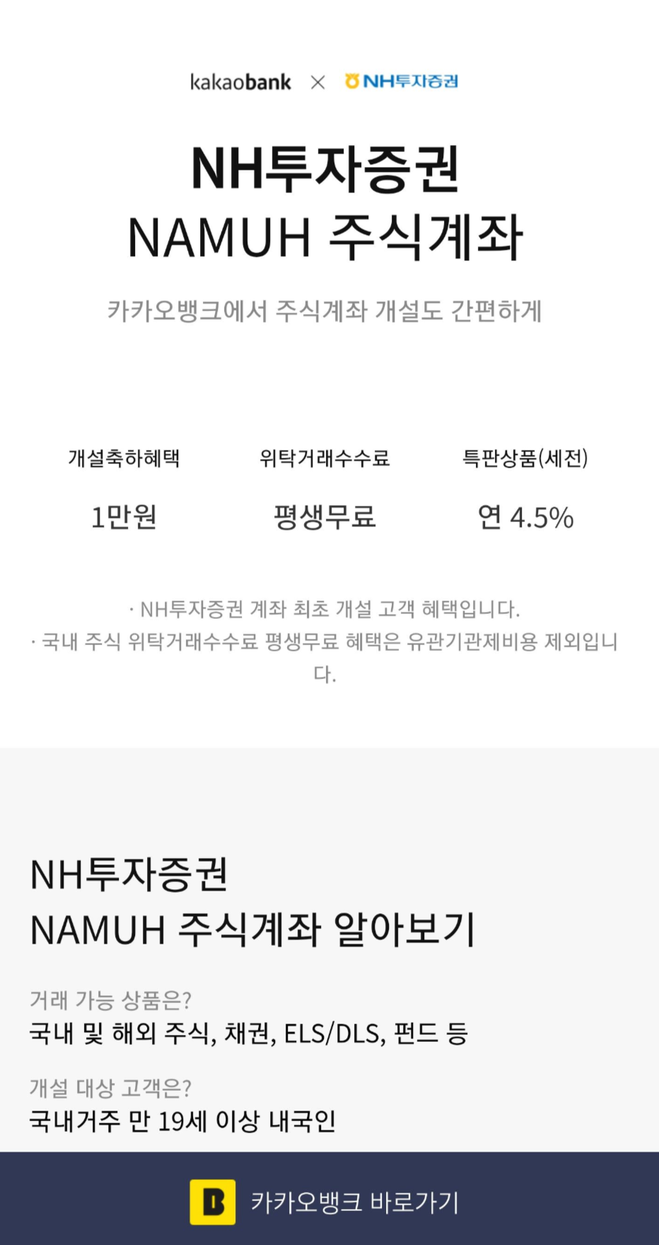 문제는 어떤 증권사를 선택할 것이냐 인데, 마침 내가 고민하는걸 알았는지 카카오뱅크와 NH투자증권을 연계하여 계좌를 개설하면 1만원의 축하금을 선물로 지급받는 이벤트 기간이라는 메세지를 보게 되었다.