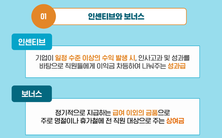 | 지급 기준 | 정기적, 일률적 (근속, 직급 등) 📅 | 비정기적, 성과 연동 (개인/조직/회사 실적) 📈 |