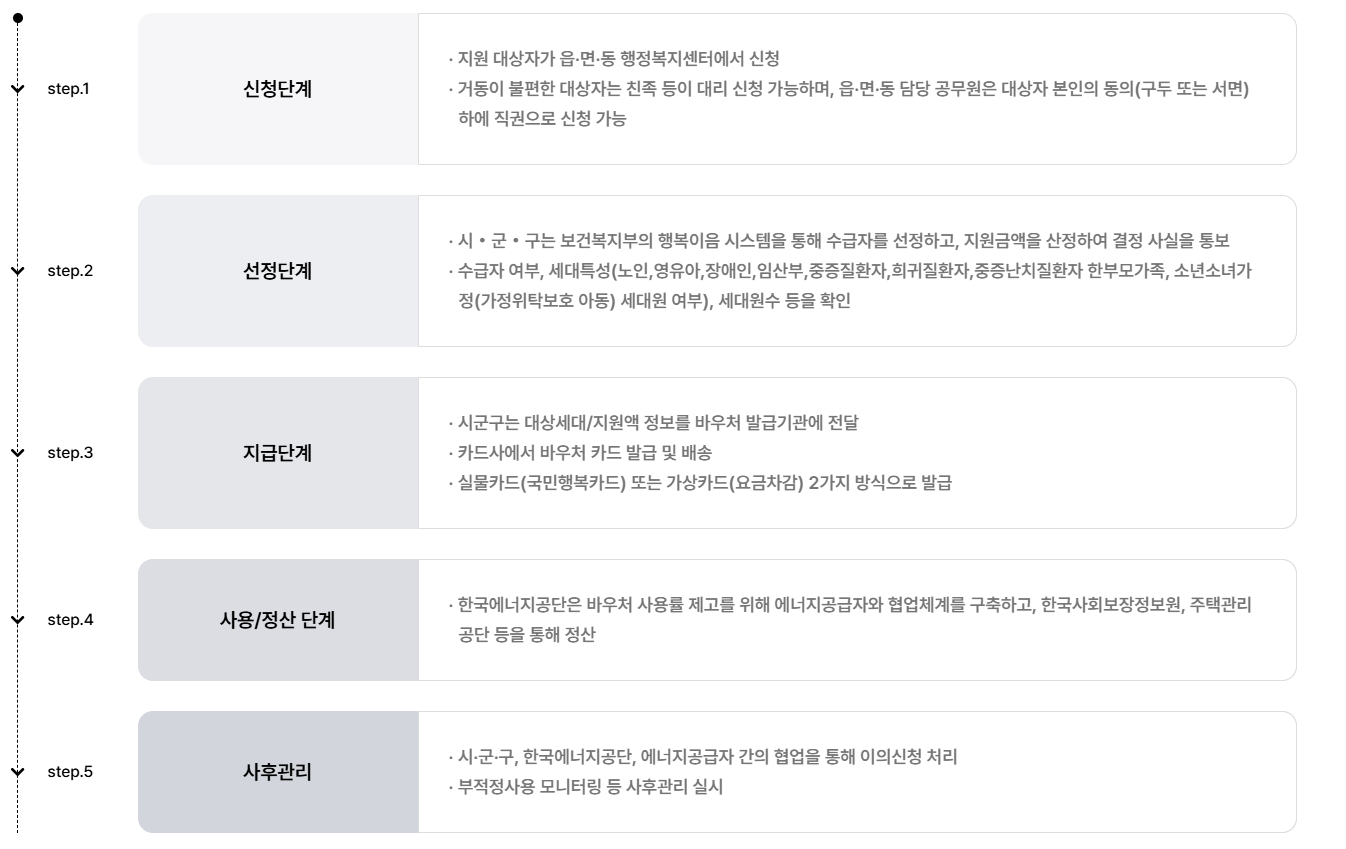 - 어떻게? 주민센터에서 신청할 때 원하는 에너지원(하절기엔 전기만, 동절기엔 전기/도시가스/지역난방 중 택1)을 선택하면, 다음 달 요금부터 자동으로 바우처 금액이 차감된답니다. 간편하게 요금 고지서에서 확인만 하면 끝!
