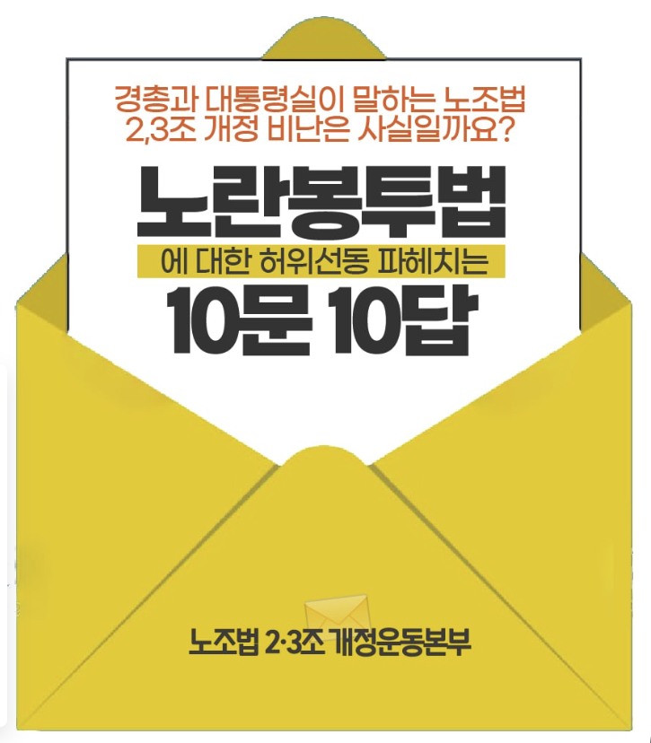 - 궁극적 목표: 노란봉투법은 노동조합의 쟁의행위(파업 등)로 인한 손해배상 청구 및 가압류를 제한하고, 노동 3권(단결권, 단체교섭권, 단체행동권)을 실질적으로 보장하려는 목적으로 발의되었습니다. 특히, 하청 노동자 등 간접고용 노동자들의 교섭권을 보호하는 데 중점을 둡니다.