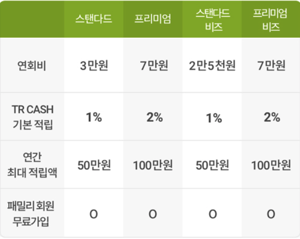 - 트레이더스 클럽은 여러 가지 멤버십 등급을 운영하며, 각 등급별로 제공하는 혜택에 차이가 있습니다. 높은 등급의 멤버십일수록 더 높은 TR 캐시 적립률이나 추가적인 서비스 혜택을 누릴 수 있습니다. 자신의 소비 패턴에 맞춰 유리한 등급을 선택할 수 있습니다.
