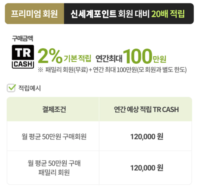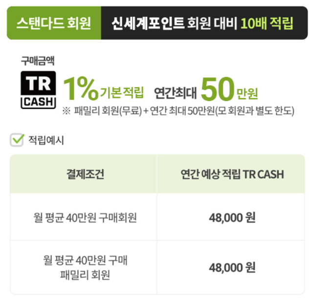- 트레이더스 클럽 회원으로 결제 시, 구매 금액의 일부를 TR 캐시로 적립받을 수 있습니다. 적립된 TR 캐시는 일정 금액 이상이 되면 현금처럼 사용할 수 있어 실질적인 쇼핑 비용 절감 효과를 가져다줍니다. 멤버십 등급에 따라 적립률이 달라질 수 있습니다.