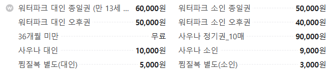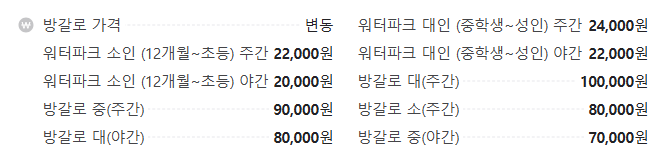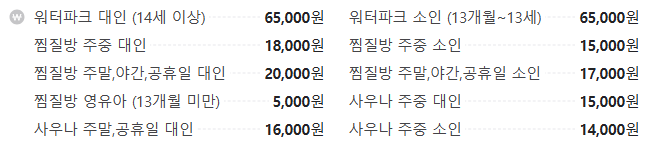 - 워터파크 종일권: 주중 65,000원, 주말/공휴일 65,000원