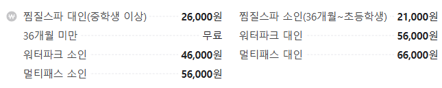 - 워터파크 (6시간): 대인 56,000원, 소인 46,000원