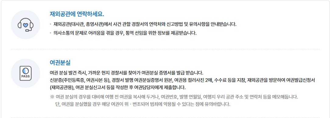 - 여권 분실 외에도 안전 관련 지원 요청 가능