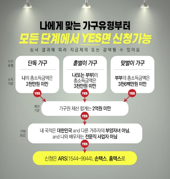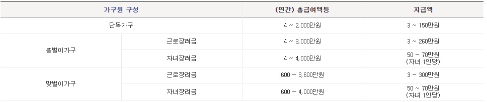 -가구원 구성에 따라 연간 부부소득 합산 총 소득금액 이 기준금액 미만이어야 하며 (단독 2천만원, 홀벌이 3천만원, 맞벌이 36백 만원), 총급여액등에 의하여 장려금 산정