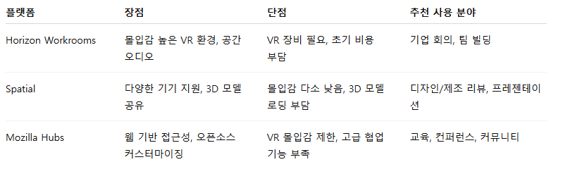 대표 플랫폼으로는 Horizon Workrooms, Spatial, Mozilla Hubs가 있습니다. 각각 특징과 활용 사례를 비교해보겠습니다.