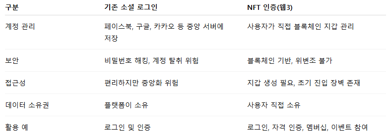 구분기존 소셜 로그인NFT 인증(웹3)