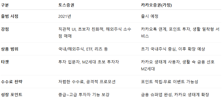 👉 정리하자면, 토스증권은 이미 폭넓은 상품을 제공하고 있고, 카카오증권은 카카오페이 포인트 연계 투자라는 독자적 강점을 활용할 가능성이 높습니다.