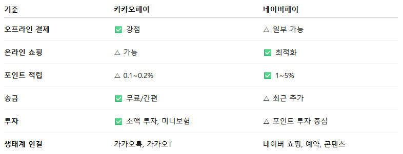 카카오페이와 네이버페이는 각각 생활 금융 vs 온라인 금융이라는 강점을 가지고 있으며, 두 서비스를 병행하면 오프라인 결제와 온라인 쇼핑을 모두 최적화할 수 있습니다.