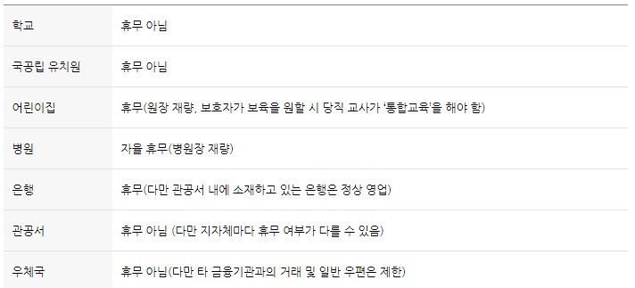 은행, 병원, 어런이집의 경우 근로기준법에 적용을 받는 근로자라서 휴무가 적용되는데 병원이나 어린이집같은 경우는 원장 재량에 따라 휴무 여부가 달라지기도 한다.