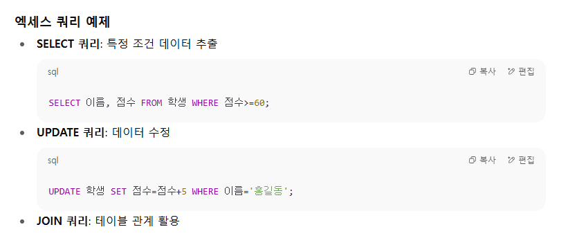 - 데이터베이스 일반: 엑세스 테이블, 쿼리, 관계형 데이터베이스 개념