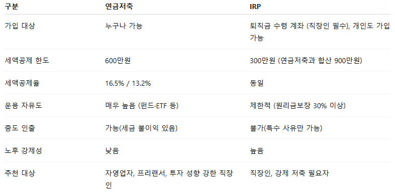 👉 결론: 세액공제 혜택을 최대로 누리려면 연금저축 + IRP를 함께 운용하는 것이 유리합니다.