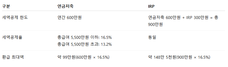 👉 연금저축으로 600만원 한도를 채운 뒤 IRP로 추가 300만원을 납입하는 것이 가장 합리적인 전략입니다.