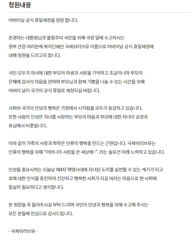 어버이날 공식 휴일제정을 청원합니다. > 대한민국 청와대