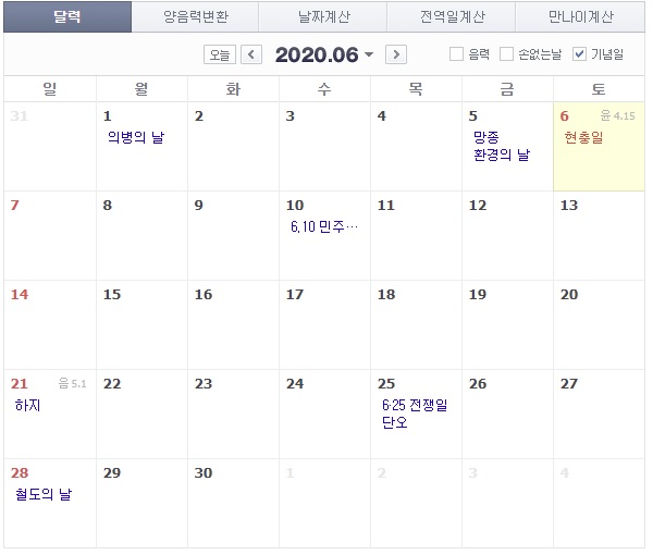 그렇다면 6월 6일 현충일에 맞춰 적절하게 업무를 분배하고 재충전할 계획을 세워볼까 하고 달력을 봤더니 이게 왠일인지 현충일 날짜가 눈을 의심케 했다