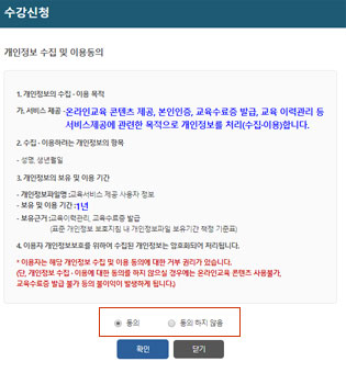 개인벙보 수집 및 이용동의 내용을 잘 읽어 보고 동의를 선택하면 수강신청을 할 수 있다.