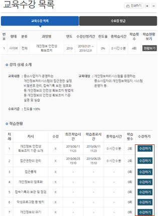 다음단계로 넘어가면 교육수강 목록이 나타나는데 과정명을 선택하면 수강 화면으로 이동한다.