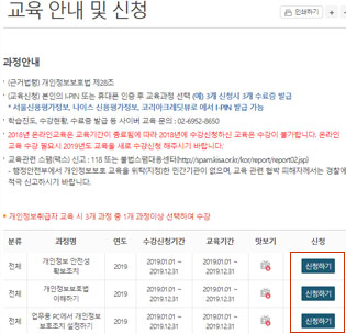 만약 보다 더 전문적인 교육을 받고자 한다면, 행정안전부에서 주최하는 현장교육이나, 전문강사를 통한 교육을 받는 방법도 있는데 마찬가지로 개인정보보호 종합포털 사이트를 통해서 신청 할 수 있다.