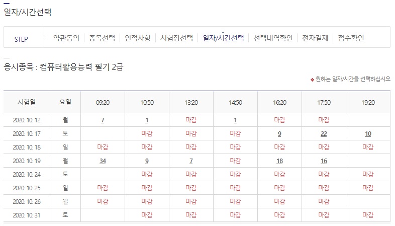 시험 일자와 시간별로 응시가 가능한 인원이 표시되는데 화면으로 보면 알수있다시피 요즘에는 원하는 시간대에 골라서 응시하는 것이 쉽지 않은 상황이다.