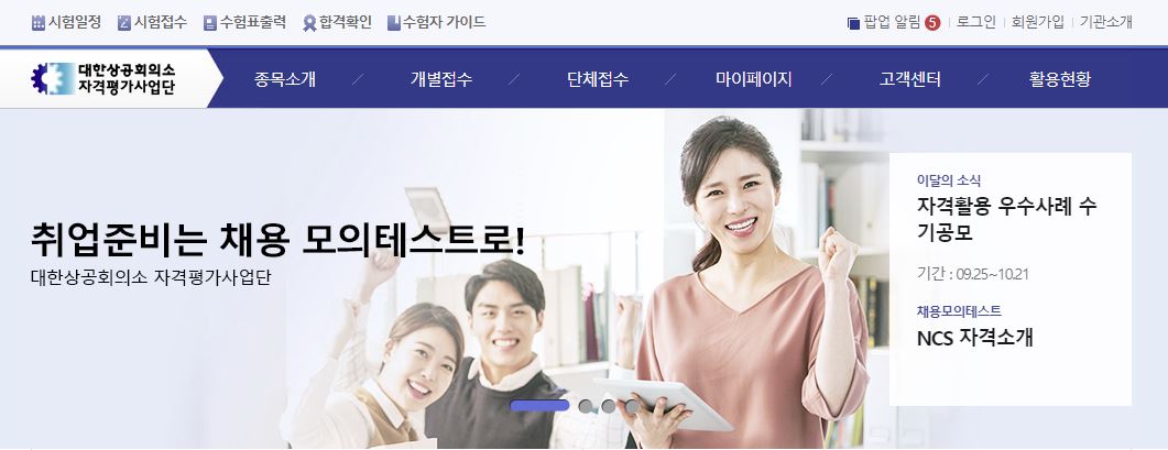 컴퓨터 활용능력시험은 대한상공회의소에서 주관하는 시험으로 시험을 신청하기 위해서는 대항 상공회의소 자격평가사업단 사이트에 우선 접속해야 한다.