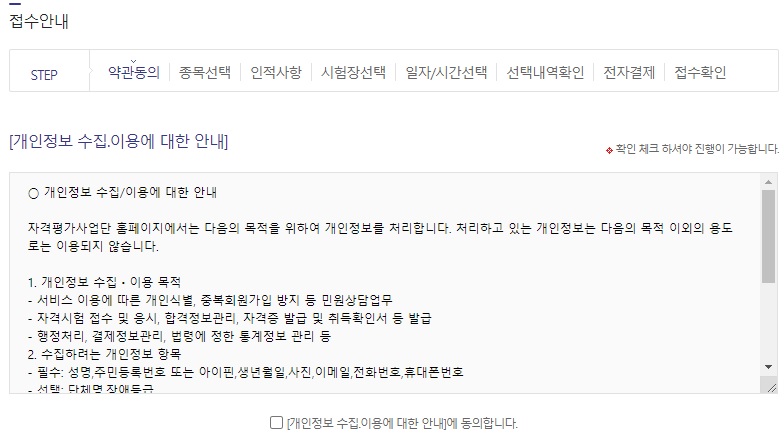 개인정보 수집, 이용에 대한 안내 , 개인영상정보 수집. 이용에 대한 안내 , 수험료 반환제도 안내 내용확인, 신분증 지참 강화에 따른 안내. 시험응시자에 대한 사전 안내 등과 같이 각각의 항목이 있는데 세부내용을 잘 읽어보고 체크를 해야한다.