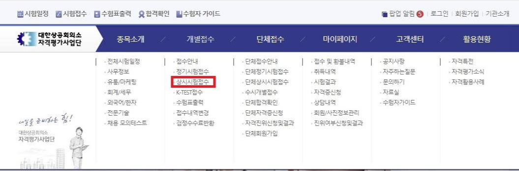 메인 화면에보면 파란색 파탕으로 각 카테고리가 나뉘어져 있는데 컴활 자격증 시험 신청을 위해서는 개별접수탭에 마우스를 올리면 상세 메뉴가 나오게 된다.