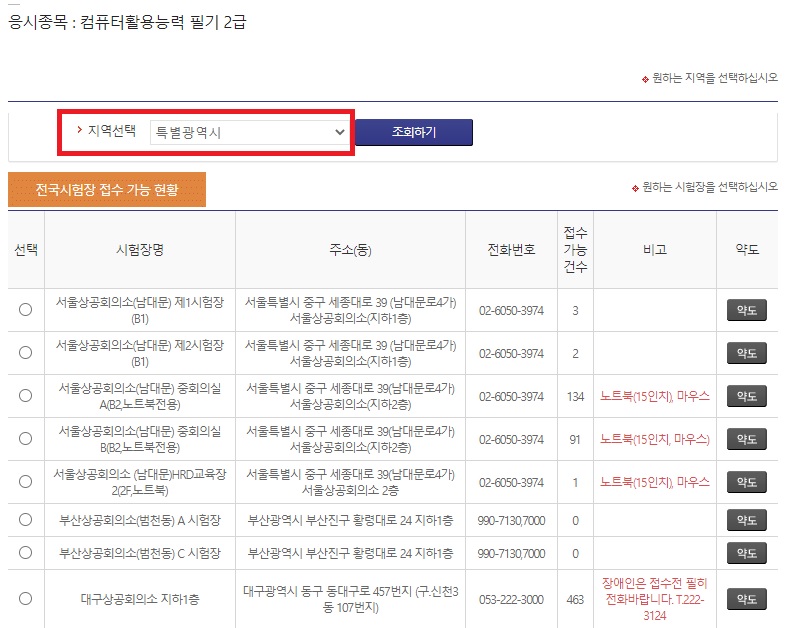 도시별로 응시 지역을 선택하면, 해당되는 시험장에 대한 위치와 응시 인원등에 대한 간략한 정보들이 리스트업되어 나온다.