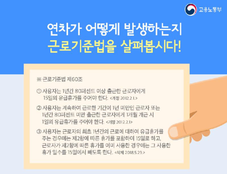 연차 유급휴가에 대한 법적인 근거는 근로기준법 제 60조를 기준으로 한다.