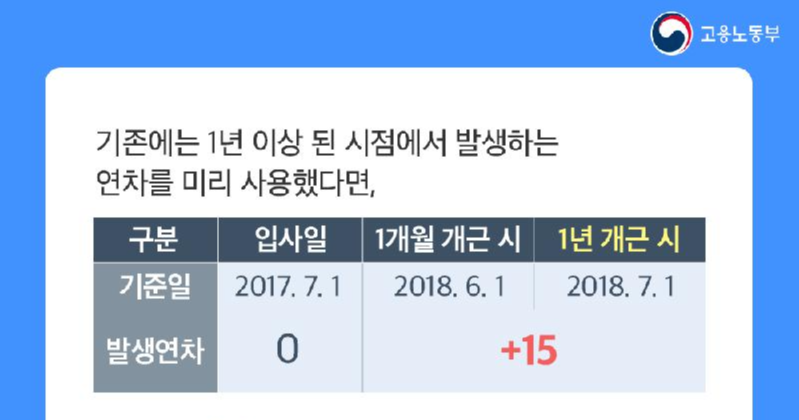 예를 들어 2017년 1월 1일 입사자의 경우 1년을 기준으로 한다면 2018년 7월 1일이 되는 시점에 15개의 연차가 발생하게 된다.